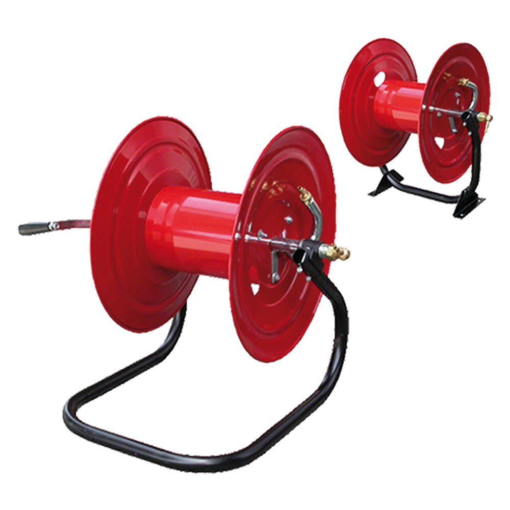 In acciaio verniciato. Pressione d’esercizio max 40 ATM, portagomma da ø mm 8/10. Può contenere max 250 mt di tubo avvolto.