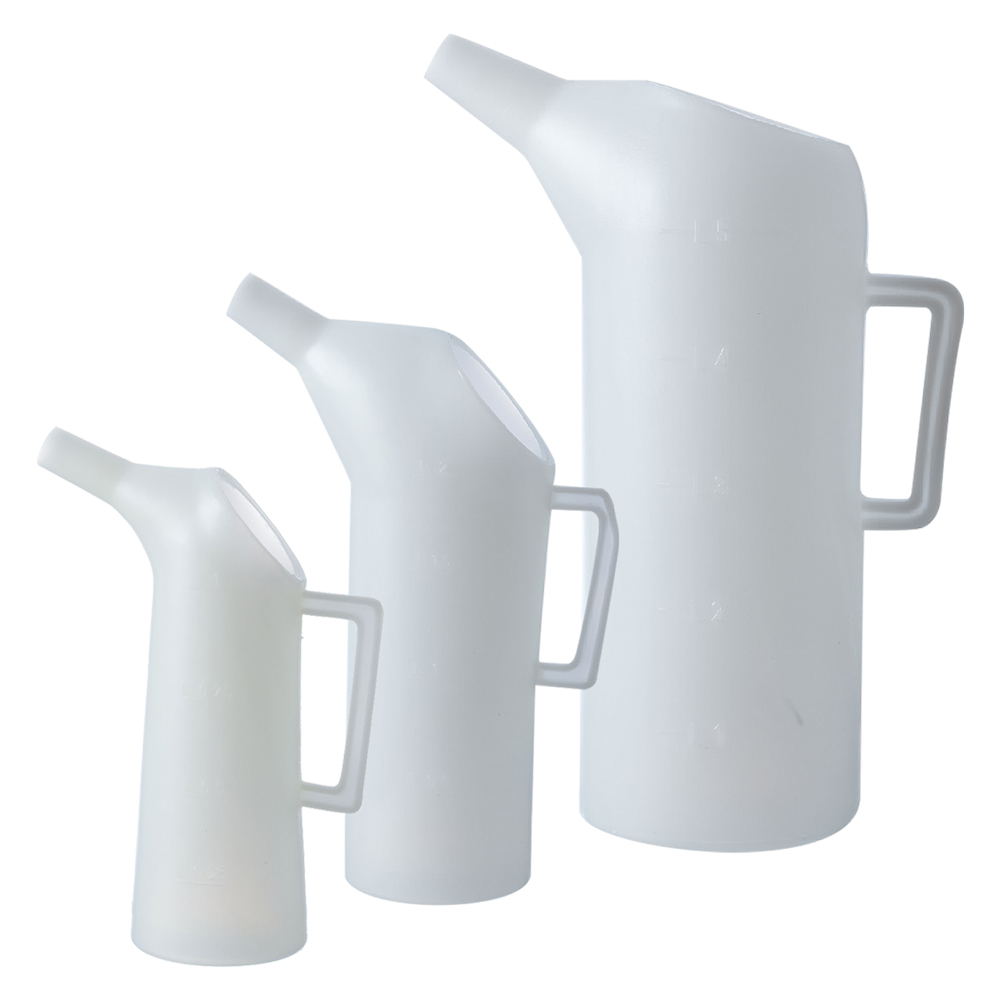 In plastica resistente, progettata per il travaso preciso di olio. Dotata di beccuccio a imbuto integrato per un versamento controllato e scala graduata per un dosaggio accurato.
