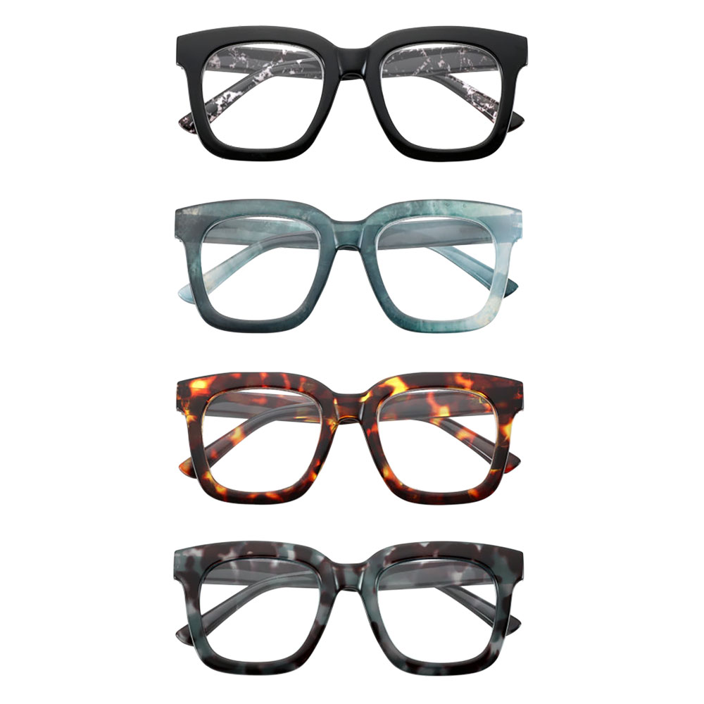 In pallbox da banco. Dispositivi medici certificati a marchio CE conformi alla norma EN 9001:2008, con autorizzazione Ministero della Salute. Testati da ‘Certottica’. Adatti per presbiopia, sono realizzati in leggero materiale organico iniettato, aste flessibili con meccanismo a molla. Lenti asferiche infrangibili ed ultrasottili, antigraffio ed antiriflesso. Completi di astuccio, confezionati in blister. Composizione box: 6 diottrie +1, +1,50, +2, +2,50, +3, +3,50 nelle 4 colorazioni disponibili nero marmorizzato, verde marmorizzato, tartaruga, tartaruga azzurro. Espositore da banco in cartone da 24 posti (cm 21x21x53 – lxpxh) omaggio.