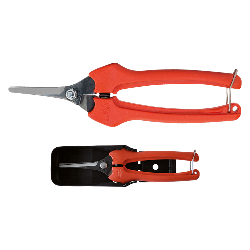 Lama diritta in acciaio inox, testa di taglio lunga e sottile piegata a 11 gradi per raggiungere gli steli più nascosti. Manico in poliammide e rinforzato da fibra di vetro. Adatta per vendemmia, raccolta frutti, fiori e ortaggi. Apertura 35 mm. Chiusura di sicurezza in metallo.
