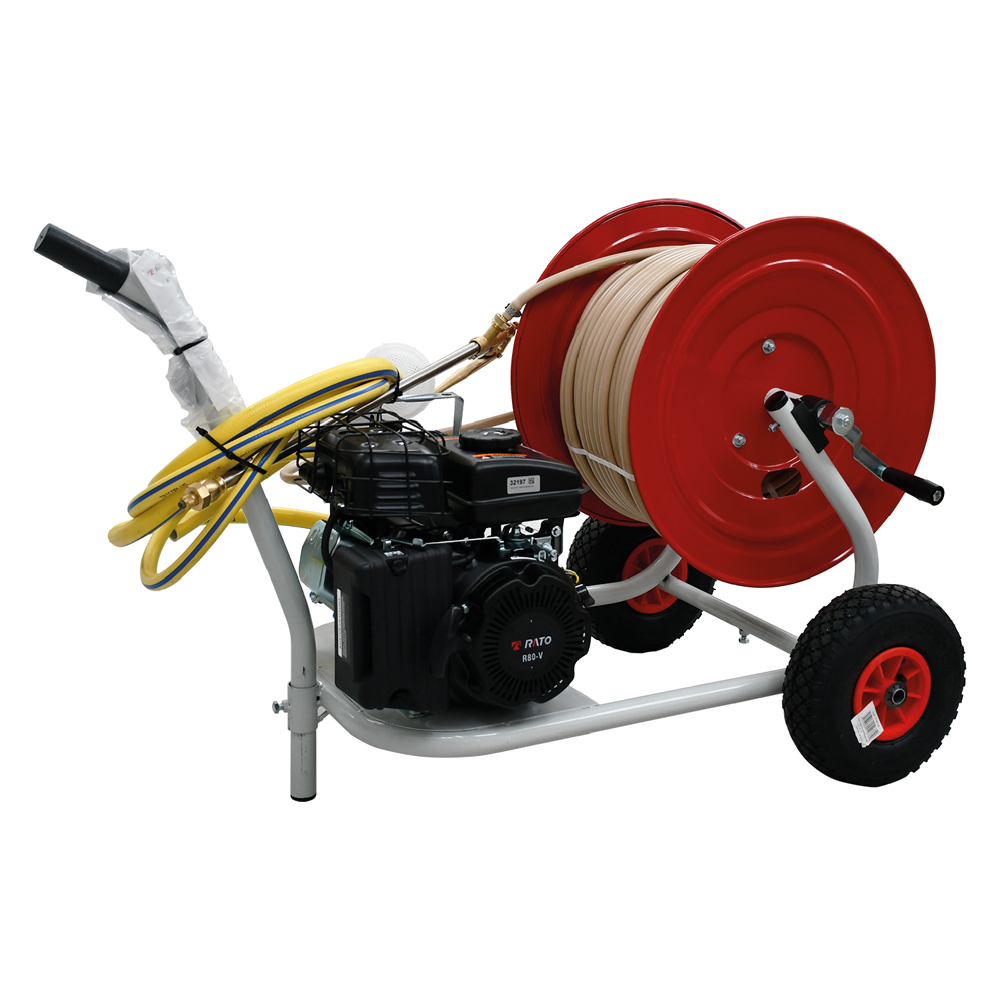 Motore quattro tempi. Con carrello avvolgitubo, mt. 100, tubo gomma 20 bar. Lancia cm 60, tubo di scarico e aspirazione completo di filtro. Portata lt./min. 23,2. Alimentazione benzina.