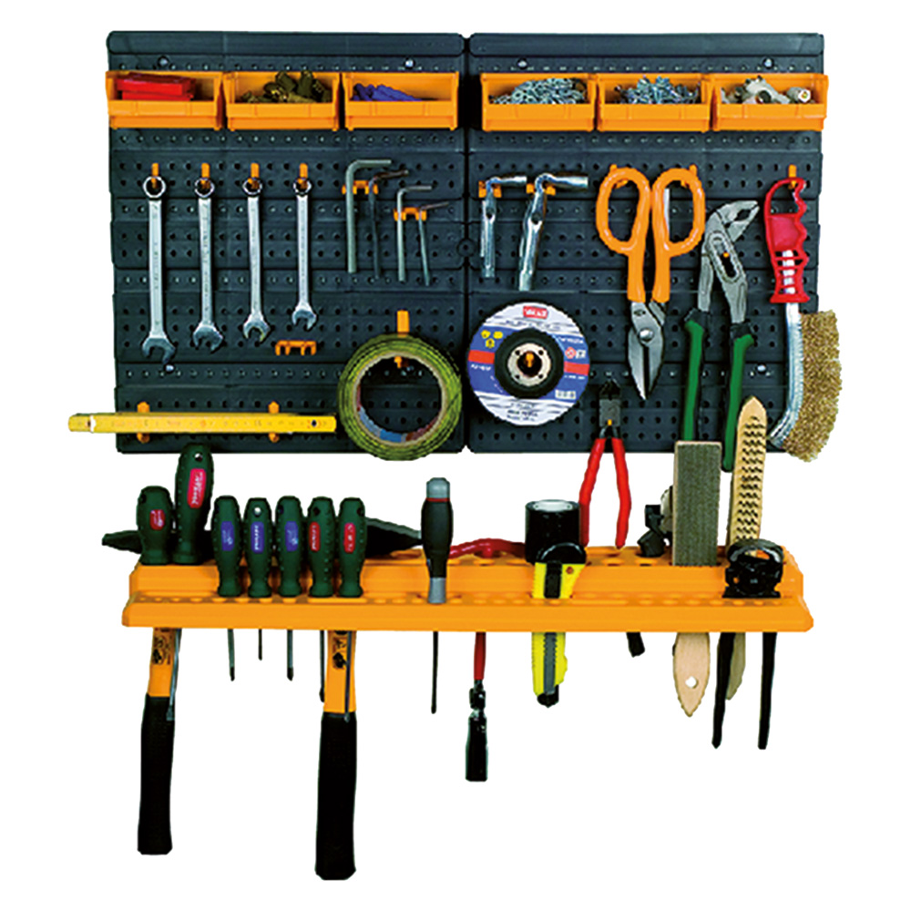 Con mensola porta attrezzi, 6 contenitori e 19 ganci assortiti. In polipropilene. Fornito vuoto.