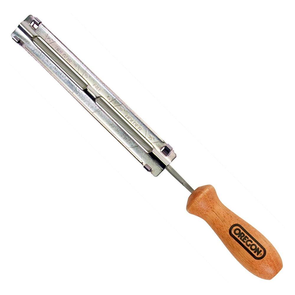 Completo di manico, lima e guida. Ottimo per affilare i taglienti delle catene per motosega. Le tacche sul bordo della guida agevolano l’allineamento della lima per ottenere l’angolo corretto di affilatura sulla piastra superiore del tagliente. Adatta per catene passo 1/4 e 3/8 low profile.