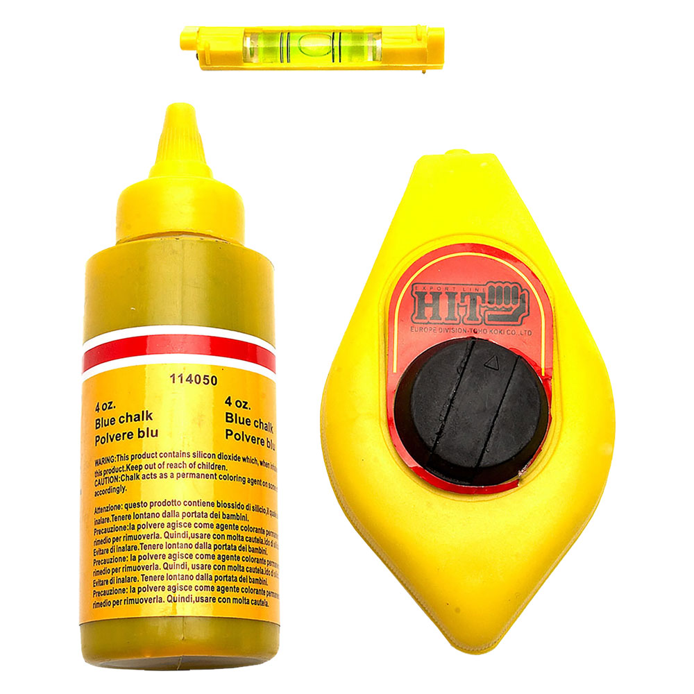 Cassa in materiale plastico con manovella a rapido di avvolgimento. Completo di filo in poliestere da 30 mt, flacone da 115 ml. di polvere blu e mini livella in plastica antiurto. In blister.